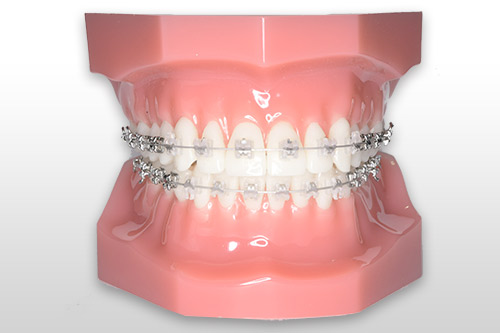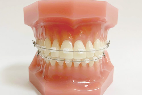 一般的には金属を含んだブラケット装置に銀色の針金を使用しますが、銀色の装置が目立つことが気になる場合は、透明な素材で作られたブラケットを装着し、白いワイヤーを使用することで、目立たないようにする方法もあります(※)。また、当院では金属アレルギーの方にも対応できる装置も用意しています。